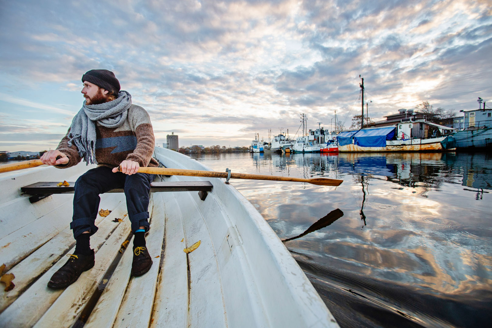 Jag tar steget. Simon ror henne andaktsfullt. Det droppar från årorna i vattnet. En trut flyger förbi och hösten har tagit ett grepp om staden och färgat löven röda. Vi glider förbi Drömmarna Kaj och tittar på alla båtar som ligger där och väntar. Somliga på att äntligen få sjunka mot botten efter ett liv av hårt arbete, andra med nymålade skrov och förhoppningar om de stora haven.